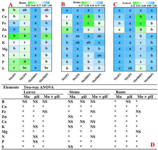Heatmaps of the other nutrient distributions in roots (A), stems (B), and leaves (C) under Mn-pH treatments, and two-way ANOVA (D). Results were the means of 4 replicates. For (A–C), different letters in the same row for the same tissue indicate a significant difference at p ≤ 0.05. For (D), NS indicates that the F values for Mn, pH, and Mn × pH are not significant (p > 0.05); * indicates that the F values for Mn, pH, and Mn × pH are significant at p ≤ 0.05. Mn2P3, Mn2 + P3; Mn2P5, Mn2 + P5; Mn500P3, Mn500 + P3; Mn500P5, Mn500 + P5.