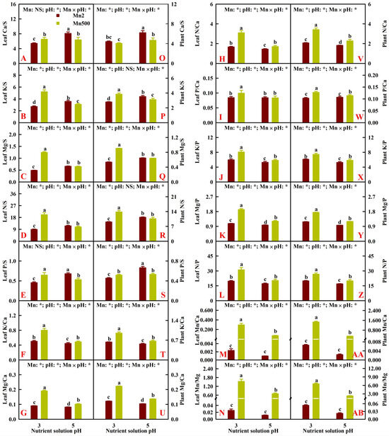 Effects of Mn-pH treatments on the mean (±SD, n = 4) ratios of Ca, K, Mg, N, and P concentrations to S concentration, K, Mg, N, and P concentrations to Ca concentration, K, Mg, and N concentrations to P concentration, and Mn concentration to Ca and Mg concentrations in leaves (A–N), as well as the ratios of Ca, K, Mg, N, and P uptake per plant (UPP) to S UPP, K, Mg, N, and P UPP to Ca UPP, K, Mg, and N UPP to P UPP, and Mn UPP to Ca and Mg UPP (O–AB). The bars with different letters indicate significant differences at p ≤ 0.05. Mn: NS and pH: NS indicate that the F values for Mn and pH are not significant (p > 0.05). Mn: *, pH: *, and Mn × pH: * indicate that the F values for Mn, pH, and Mn × pH are significant at p ≤ 0.05.