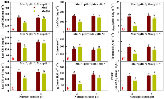 Effects of Mn-pH treatment on the mean (±SD, n = 4) Chl a (A), Chl b (B), Chl a + b (C), Car (D), Ci (E), gs (F), ACO2 (G), Tr (H), and IWUE (I) in leaves. ACO2, CO2 assimilation; Car, carotenoids; Chl, chlorophyll; Ci, intercellular CO2 concentration; gs, stomatal conductance; IWUE, instantaneous water use efficiency; Tr, transpiration rate. The bars with different letters indicate significant differences at p ≤ 0.05. Mn × pH: NS indicates that the F value for Mn × pH is not significant (p > 0.05). Mn: *, pH: *, and Mn × pH: * indicate that the F values for Mn, pH, and Mn × pH are significant at p ≤ 0.05.
