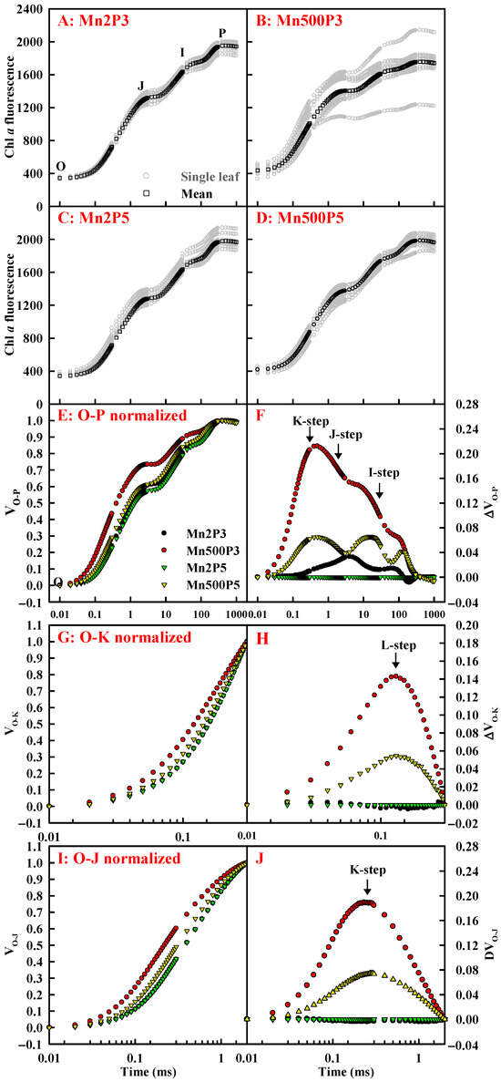 Effects of Mn-pH on OJIP transients of dark-adapted leaves (A–D), as well as the mean OJIP transients expressed as the kinetics of relative variable fluorescence: between Fo and Fm (O-P normalized): VO-P = (Ft − Fo)/(Fm − Fo) (E) and the differences of the 4 samples to the reference sample treated with Mn2P5 (ΔVO-P; (F)); between Fo and F300μs (O-K normalized): VO-K = (Ft − Fo)/(F300μ − Fo) (G) and the differences of the 4 samples to the reference sample (ΔVO-K; (H)); and between Fo and FJ (O-J normalized): VO-J = (Ft − Fo)/(FJ − Fo) (I) and the differences of the 4 samples to the reference sample (ΔVO-J; (J)). Ft, fluorescence at time t after onset of actinic illumination; Fo, minimum fluorescence; Fm, maximum fluorescence; F300μs, fluorescence intensity at 300 μs; FJ, fluorescence intensity at the J-step (2 ms).