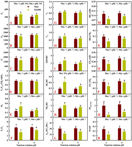 Effects of Mn-pH treatments on the mean (±SD, n = 10) Fo (A), Fm (B), Fv (C), Fv/Fm or TRo/ABS (D), Mo (E), Fv/Fo (F), VI (G), VJ (H), ABS/RC (I), DIo/RC (J), TRo/RC (K), Sm or ECo/RC (L), REo/ABS (M), REo/TRo (N), ETo/ABS (O), ETo/TRo (P), PIabs,total (Q), and MAIP (R) in leaves. Fv, maximum variable fluorescence; Fv/Fm or TRo/ABS, maximum quantum yield of primary photochemistry; Mo, approximated initial slope (in ms−1) of the fluorescence transient V = f(t); Fv/Fo, maximum primary yield of photochemistry of photosystem II (PSII); VI, relative variable fluorescence at the I-step (30 ms); VJ, relative variable fluorescence at the J-step (2 ms); ABS/RC, absorption flux per reaction center (RC); DIo/RC, dissipated energy flux per reaction center; TRo/RC, trapped energy flux per RC; Sm or ECo/RC, total electron carriers per RC; REo/ABS or φRo, quantum yield for the reduction in end acceptors of photosystem I per photon absorbed; REo/TRo or ρRo, efficiency with which a trapped exciton can move an electron into the electron transport chain from QA− to the photosystem I end electron acceptors; ETo/ABS or φEo, quantum yield for electron transport; ETo/TRo or ψEo, probability that a trapped exciton moves an electron into the electron transport chain beyond QA−; PIabs,total, total performance index; MAIP, maximum amplitude of IP phase. The bars with different letters indicate significant differences at p ≤ 0.05. pH: NS and Mn × pH: NS indicate that the F values for pH and Mn × pH are not significant (p > 0.05). Mn: *, pH: *, and Mn × pH: * indicate that the F values for Mn, pH, and Mn × pH are significant at p ≤ 0.05.