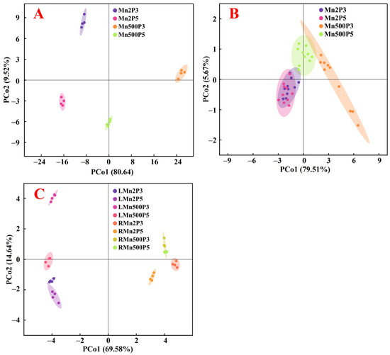 PCoA plots of 125 parameters for nutrients (33 nutrient concentrations, 11 nutrient UPP, 11 nutrient UPR, 33 nutrient distributions, and 28 ratios), pigments (4), gas exchange (5) (A), 24 parameters for growth (6) and fluorescence (18) (B), and 22 common parameters for roots and leaves (11 nutrient concentrations and 11 nutrient distributions) (C) from ‘Sour pummelo’ seedlings exposed to different Mn-pH treatments. LMn2P3, leaves of seedlings treated with Mn2P3; LMn2P5, leaves of seedlings treated with Mn2P5; LMn500P3, leaves of seedlings treated with Mn500P3; LMn500P5, leaves of seedlings treated with Mn500P5; RMn2P3, roots of seedlings treated with Mn2P3; RMn2P5, roots of seedlings treated with Mn2P5; RMn500P3, roots of seedlings treated with Mn500P3; RMn500P5, roots of seedlings treated with Mn500P5.