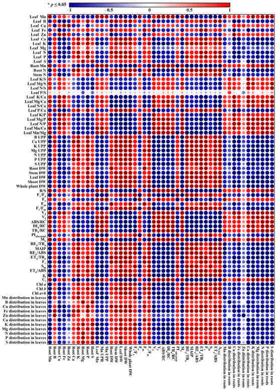 Also, both nutrient deficiencies and imbalances can disturb PETC and lessen ACO2 [51,53,54,55]. Regression analysis showed that ACO2 was significantly positively related to B, Ca, K, N, or P concentration in leaves, as well as B, Ca, K, N, P, or S uptake per plant (UPP), and negatively related to leaf Mg/S, K/Ca, Mg/Ca, N/Ca, P/Ca, K/P, Mg/P, N/P, Mn/Ca, or Mn/Mg. Additionally, Fm, Fv/Fm, PIabs,total, REo/TRo, MAIP, Fv/Fo, REo/ABS, ETo/TRo, Fv, Sm, or ETo/ABS significantly elevated or displayed an increased trend with the increment in leaf B, Fe, Ca, K, Mg, N, P, or S concentrations, as well as B, Ca, Mg, K, N, P, or S UPP, but significantly decreased or showed a lessened trend with the increment in leaf K/S, Mg/S, N/S P/S, K/Ca, Mg/Ca, N/Ca, P/Ca, K/P, Mg/P, N/P, Mn/Ca, or Mn/Mg; Fo, VJ, VI, ABS/RC, DIo/RC, TRo/RC, or Mo significantly decreased or displayed a decreased trend with the increment in leaf B, Fe, Ca, K, Mg, N, P, or S concentrations, as well as B, Ca, Mg, K, N, P, or S UPP, but significantly increased or showed a raised trend with the increment in leaf K/S, Mg/S, N/S P/S, K/Ca, Mg/Ca, N/Ca, P/Ca, K/P, Mg/P, N/P, Mn/Ca, or Mn/Mg (Figure 11 and Table S1). These results revealed that increasing pH enhanced the ability of leaves of seedlings treated with Mn500 to acquire nutrients and maintain nutrient balance, thereby resisting Mn500-induced damage to PETC and decline in ACO2.