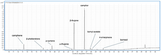 Borneol, a terpene with known insect-repellent properties, was found at concentrations ranging from 5.41% to 17.88% in 2023 (mean: 592.60 ± 79.27 µg g FW−1) and 2.18% to 3.80% in 2024 (mean: 140.09 ± 18.18 µg g FW−1).