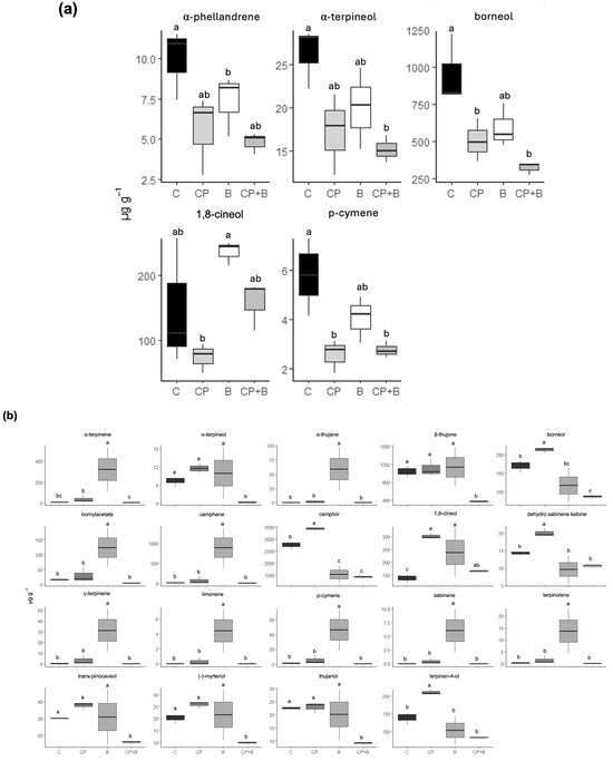 Box plots of the single compounds that have been found to be statistically different in 2023 (a) and in 2024 (b) in Tanacetum balsamita L. among treatments. C, control or no treatments; CP, compost from organic waste; B, bioinoculant; CP + B, compost and bioinoculant as the sum of CP and B treatments. Different letters within the same compound indicate significant differences according to Tukey’s HSD multiple-range test (p = 0.05).