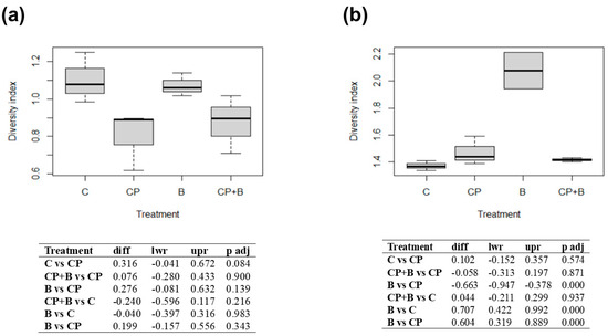 Diversity index for 2023 (a) and 2024 (b). C, control or no treatments; CP, compost from organic waste; B, bioinoculant; CP + B, compost and bioinoculant as the sum of CP and B treatments.