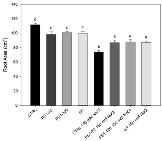 In Figure 1, it is possible to observe that the treatment with EFs did not affect root growth in the absence of salt stress, showing unchanged root area compared with the controls. Under salt stress conditions, the roots of EF-treated plants showed a significant increase in their biomass (+17%, +18% and +18% respectively after PS1-70, PS1-120 and G1 treatment), in comparison with the control, suggesting that the treatment mitigated salt stress.