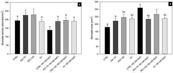 In the absence of salt, PS1-70 and PS1-120 induced a significant increase in SD (+16% and +17% respectively), as shown in Figure 2A and in Supplementary Material Figure S1. Notably, irrigations with NaCl caused an SD decrease (−28%) in control plants, while treated plants kept a higher level of SD both in the presence and absence of salt (Figure 2A).