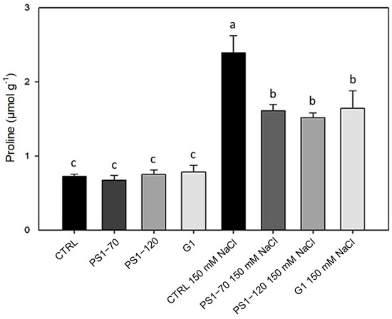 Proline contributes to the adaptation to salt stress as an activator of downstream signal transduction pathways and as an intermediary signaling effector that controls a variety of physiological and metabolic responses, including detoxification of reactive oxygen species (ROS) [18]. EF-treated plants did not influence proline content in the absence of salt, as shown in Figure 3. As expected, in salt-stressed plants, a significant increase in proline content was evident in all samples. Specifically, the presence of 150 mM NaCl caused a marked increase in proline in control plants (+228%). This content was lowered upon EF treatments to +121%, + 109% and +157% when stressed plants were treated with PS1-70, PS1-120 and G1, respectively (Figure 3).