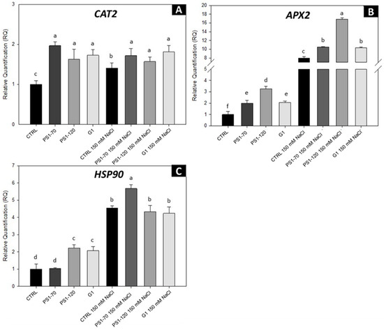 Tomato leaves harvested from control and salt-irrigated plants, treated or not with PS1-70, PS1-120 and G1, were frozen in liquid nitrogen and stored at −80 °C. RNA extraction, single-stranded cDNA synthesis and real-time RT-PCRs were carried out as previously described [64]. Primers and their main features are described in Supplementary Material Table S3.