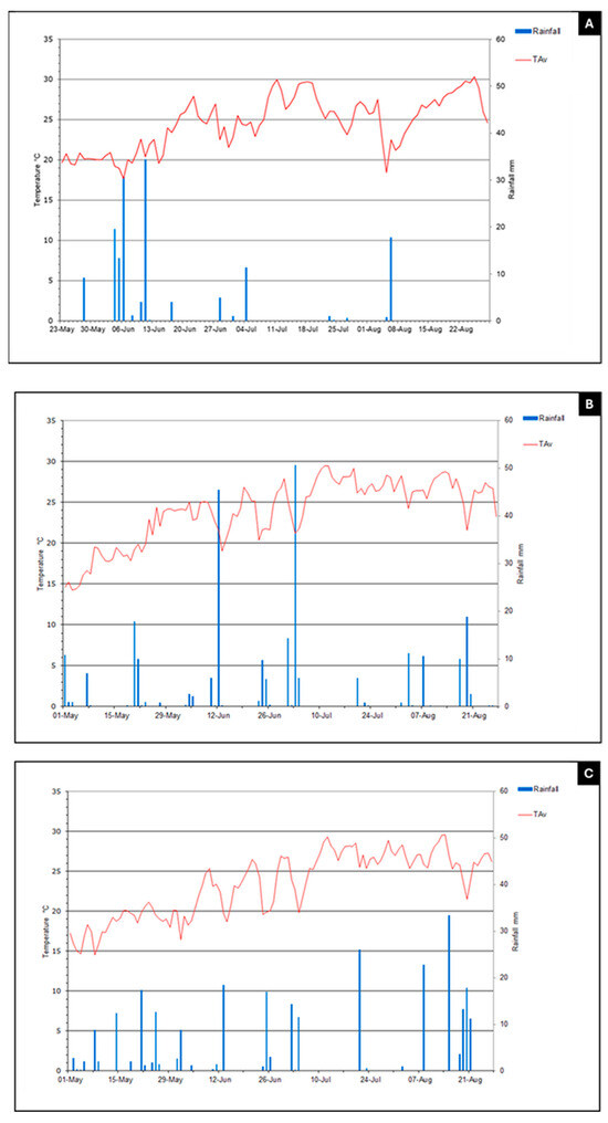The tomato crop was selected for all experiments, with specific cultivars differing across trials. In Experiment 1, the variety Barrique was cultivated, while Fokker was used in Experiment 2, and UG 1122713 F1 in Experiment 3. These trials were conducted in areas representative of industrial tomato production, integrated within commercial crop systems that also include Zea mays (maize). Weather conditions during the two growing seasons are reported in Figure 5 and in Table 3, Table 4 and Table 5. The conventional till technique was used for soil tillage. Crop water requirements were completely satisfied by localized drip irrigation (200 L/ha) until 7 days before harvesting. All studies were carried out in accordance with the principles of good experimental practices (GEPs) and EPPO guidelines.