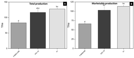 In 2023 trials (Supplementary Material Figure S2), plants treated with PS1-70 and G1 registered significant differences from the untreated plants for both total (+35% and +15% respectively) and marketable production (+46.4% and +14.3%, respectively). Additionally, plants treated with PS1-70 exhibited a slight increase compared to farm line plants of +3.8% and +2.5% for total and marketable production, respectively. No increases were registered for G1 when compared to farm line plants.