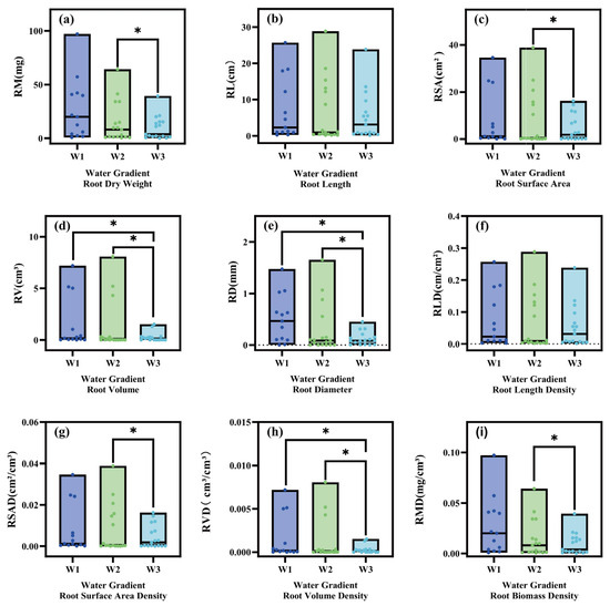 Variability in plant root traits of herbaceous plants in different communities. W1: water-rich wetland, W2: water-scarce wetland, W3: aridized wetland; subfigure (a) shows the effect of moisture status on root biomass (RM, mg); subfigure (b) shows the effect of moisture status on root length (RL, cm); subfigure (c) shows the effect of moisture status on root surface area (RSA, cm2); subfigure (d) shows the effect of moisture status on root volume (RV, cm3); subfigure (e) shows the effect of moisture status on root diameter (RD, mm); subfigure (f) shows the effect of moisture status on root length density (RLD, cm/cm3); subfigure (g) shows the effect of moisture status on root surface area density (RSAD, cm2/cm3); subfigure (h) shows the effect of moisture status on root volume density (RVD, cm3/cm3); subfigure (i) shows the effect of moisture status on root biomass density (RMD, mg/cm3); (*: p < 0.05).