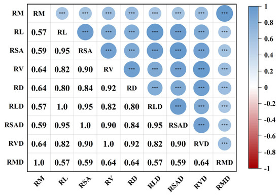 Figure 2 shows the correlations among different root trait indicators of herbaceous plants. The results revealed that most of the plant root traits were positively correlated (absolute value of correlation coefficient ≥ 0.8 and p ≤ 0.001), such as the correlation coefficients of RL and RLD, RSA and RSAD, and RV and RVD, which were 1.0. RL was also highly positively correlated with RSA, RV, and RD, which indicated that the trends of the changes in the root traits of the plants were highly consistent. There were some moderate positive correlations (absolute values of correlation coefficients between 0.5 and 0.8), such as RM with RL and RSA. Low and weak correlations (absolute values of correlation coefficient < 0.5) were not evident in the figure. Overall, there were strong positive correlations among the plant root traits, which tended to vary synergistically.