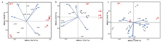 The interrelationships among ectorhizosphere soil physicochemical factors, herbaceous plant diversity indices, ectorhizosphere soil microbial diversity indices, and plant root traits were further analyzed via redundancy analysis (Figure 3). A total of 97.02% of the variance was explained by the two ordinations in the redundancy analysis of ectorhizosphere soil physicochemical factors and plant root traits (Figure 3a). RV was significantly correlated with pH (r2 = 0.7133, p = 0.004); TN (r2 = 0.6174, p = 0.012); and SOM (r2 = 0.5783, p = 0.017). RD was significantly correlated with TN (r2 = 0.7037, p = 0.005); SOM (r2 = 0.6743, p = 0.007); TP (r2 = 0.5830, p = 0.018); and pH (r2 = 0.5441, p = 0.023). In addition, RM was significantly correlated with TK (r2 = 0.6176, p = 0.012); TN (r2 = 0.5858, p = 0.016); SOM (r2 = 0.5834, p = 0.017); and TP (r2 = 0.5830, p = 0.017). RSA, RV, and RD are negatively correlated with pH, and RM was also negatively correlated with TK. pH, SOM, TN, TP, and TK were the key ectorhizosphere soil physicochemical factors that affect plant root traits. In the redundancy analysis of the diversity indices of herbaceous plants with respect to plant root traits, the two ordination axes explained 95.72% of the variance (Figure 3b). The RSA was significantly correlated with D (r2 = 0.6993, p = 0.005); H (r2 = 0.5937, p = 0.015); and E (r2 = 0.5926, p = 0.015). RV was significantly correlated with H (r2 = 0.6738, p = 0.007); D (r2 = 0.6253, p = 0.011); and E (r2 = 0.5054, p = 0.032). RD was significantly correlated with H (r2 = 0.5568, p = 0.021). RSA, RV, and RD were all negatively correlated with biotic factors, and the key herb diversity indices affecting plant root traits were D, H, and E. In the redundancy analysis of ectorhizosphere soil microbial diversity indices with plant root traits, the two ordination axes explained 99.26% of the variance (Figure 3c). RM and RMD were significantly correlated with H (r2 = 0.6690, p = 0.007). RM, RMD, and H were negatively correlated, and the key ectorhizosphere soil microbial index affecting plant root traits was H. The other ectorhizosphere soil microbial diversity indices had no significant effect on plant root traits.