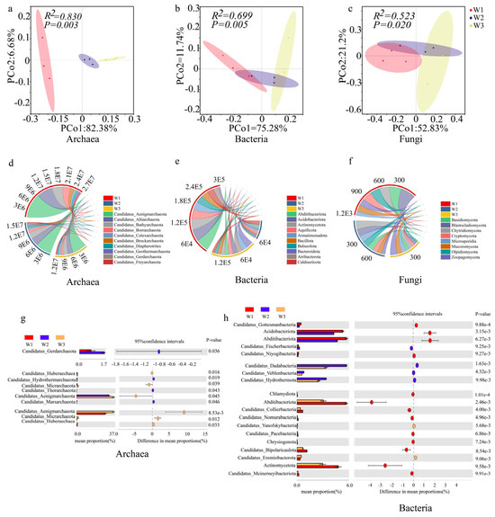 PCoA-based soil microbial community structure and its abundance pattern at key phylum level. PCoA: Principal Coordinate Analysis, used to show the similarity of soil microbial community structure in different sites; different colors and shapes of dots represent the sample sites under different moisture status: red is W1, purple is W2, yellow is W3, and the further distance between the dots indicates the greater differences in the microbial community structure; (a) is the PCoA diagram for archaea; (b) is the PCoA diagram for bacteria; (c) is the PCoA diagram for fungi. Chordal plots show the relative abundance of the major phyla of archaea (d), bacteria (e), and fungi (f) under different moisture status: red is W1, blue is W2, yellow is W3;STAMP analysis identifies key taxa and changes in relative abundance of key phyla at the phylum level for archaea (g) and bacteria (h): red is W1, blue is W2, yellow is W3.