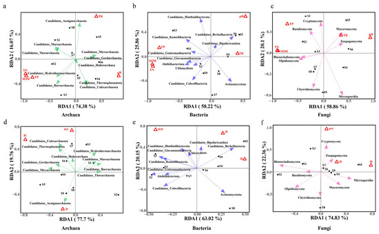 Figure 5 redundancy analysis revealed that for the archaeal factors at the phylum level (Figure 5a,d), SOM was positively correlated with Candidatus_Borrarchaeota, Candidatus_Hydrothermarchaeota, Candidatus_Huberarchaea, Candidatus_Thorarchaeota, Candidatus_Aenigmarchaeota, and Candidatus_Marsarchaeota were highly significantly positively correlated, and Candidatus_Micrarchaeota and Candidatus_Thermoplasmatota were significantly negatively correlated; TP was significantly positively correlated with Candidatus_Huberarchaea, Candidatus_Borrarchaeota, Candidatus_Aenigmarchaeota, Candidatus_Thorarchaeota, Candidatus_Hydrothermarchaeota, Candidatus_Marsarchaeota, Candidatus_Thermoplasmatota, and Candidatus_Culexarchaeota; TN was significantly positively correlated with Candidatus_Borrarchaeota, Candidatus_Thorarchaeota, Candidatus_Hydrothermarchaeota, Candidatus_Huberarchaea, Candidatus_Aenigmarchaeota, Candidatus_Marsarchaeota, and Candidatus_Micrarchaeota were was significantly positively correlated; pH was significantly positively correlated with Candidatus_Micrarchaeota and Candidatus_Gerdarchaeota; TK was significantly negatively correlated with Candidatus_Borrarchaeota; and D was significantly positively correlated with Candidatus_Thorarchaeota and Candidatus_Marsarchaeota. For bacteria at the phylum level (Figure 5b,e), TP was associated with Candidatus_Gottesmanbacteria, Candidatus_Berkelbacteria, Candidatus_Giovannonibacteria, Actinomycetota, Chlamydiota, and Abditibacteriota, which were highly significantly positively correlated with Candidatus_Colwellbacteria, Candidatus_Komeilibacteria, Candidatus_Bipolaricaulota, and Candidatus_Hinthialibacterota. SOM and TN were highly significantly positively correlated with all key bacterial phyla; TK was significantly positively correlated with Candidatus_Colwellbacteria and Actinomycetota; D was significantly positively correlated with Candidatus_Bipolaricaulota and Candidatus_Berkelbacteria; and H was significantly positively correlated with Candidatus_Hintbialibacterota and Candidatus_Giovannonibacteria. For fungi at the phylum level (Figure 5c,f), TP was significantly and positively correlated with Cryptomycota, Basidiomycota, and Mucoromycota; SOM was significantly negatively correlated with Zoopagomycota and Olpidiomycota; pH was significantly negatively correlated with Chytridiomycota; TK was significantly positively correlated with Cryptomycota and Basidiomycota; D was significantly positively correlated with Cryptomycota and Basidiomycota; Ace was significantly positively correlated with Zoopagomycota and Olpidiomycota; and H was significantly positively correlated with Zoopagomycota and Olpidiomycota.