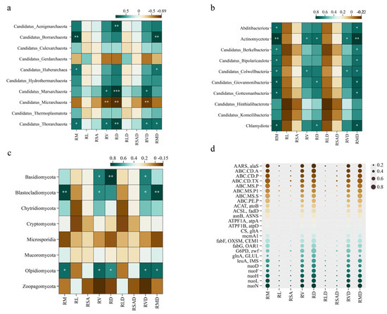 As shown in Figure 6, there were correlations between different microbial phyla and plant root traits. At the level of archaea (Figure 6a), Candidatus_Aenigmarchaeota was significantly positively correlated with RD; both Candidatus_Borrarchaeota and Candidatus_Huberarchaea were significantly positively correlated with RM and RMD; Candidatus_Marsarchaeota was significantly positively correlated with RV, RD, and RVD; Candidatus_Thorarchaeota was significantly positively correlated with RM, RV, RD, RVD, and RMD; conversely, Candidatus_Micrarchaeota was significantly negatively correlated with RV, RD, and RVD. At the bacterial phylum level (Figure 6b), Abditibacteriota, Candidatus_Berkelbacteria, Candidatus_Bipolaricaulota, and Candidatus_Gottesmanbacteria were significantly positively correlated with RM and RMD; Candidatus_Giovannonibacteria and Chlamydiota were significantly positively correlated with RM, RD, and RMD; Actinomycetota was significantly positively correlated with RM, RV, RD, RVD, and RMD; and Candidatus_Colwellbacteria was significantly positively correlated with RM, RV, RVD, and RMD. At the fungal phylum level (Figure 6c), Basidiomycota was significantly positively correlated with RV, RD, and RVD; Blastocladiomycota was significantly positively correlated with RM, RD, RVD, and RMD; and Olpidiomycota was significantly positively correlated with RM, RV, RD, RVD, and RMD.