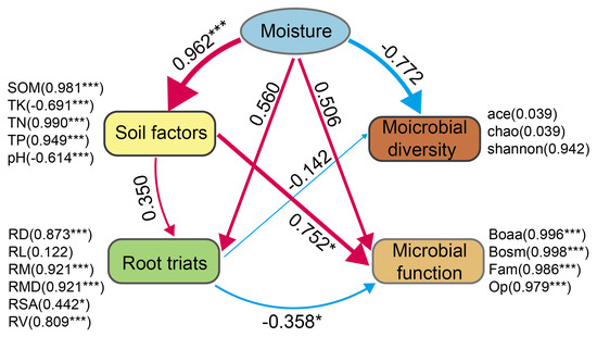 Structural equation modeling of microbial diversity and functioning. The model revealed indirect effects of moisture status on herbaceous plant root traits and soil microbial functions through soil factors such as soil organic matter—SOM, total nitrogen—TN, total phosphorus—TP, and pH, as well as direct and indirect causal relationships between these factors (model goodness-of-fit—GOF = 0.77). One-way arrows indicate the proposed causal relationships, and path coefficients indicate the strength of these relationships; positive correlations are indicated by red arrows and negative correlations by blue-colored arrows, with the width of the arrow corresponding to the strength of the relationship. In the model, SOM, TN, TP, TK, and pH were the key soil factors affecting plant root traits and microbial function; plant root traits had a significant positive effect on microbial function, and moisture status also directly affected microbial function significantly and positively. (*: p < 0.05, ***: p < 0.001.)