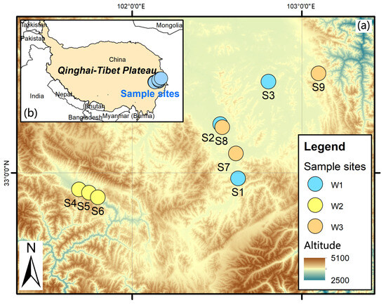 Locations of sample sites. After investigation, we selected nine wetland sample sites with three different moisture statuses: water-rich wetlands (W1), water-scarce wetlands (W2), and aridized wetlands (W3) in the eastern Tibetan Plateau. (a) shows the positions of the sample sites we selected on a small scale; (b) shows the locations of our sampling points on this large scale in the eastern part of the eastern Tibetan Plateau. For soil sampling, we set up a 20 m × 20 m sample square within each sample plot and randomly selected three sampling points in each sample square. Before collecting soil samples, visible plant and animal debris and apomictic material were removed, and then periapical soil was collected from 10 cm × 10 cm clods using a clean shovel and gently swept near the plant roots into a plastic bag. Sampling was avoided in deep water; if shallow water was encountered, it was drained before sampling. Subsequently, three soil samples from each sample plot were thoroughly mixed to make a composite soil sample from which fine roots and larger plant fragments were removed. Finally, the well-mixed soil samples were divided into two portions: one was naturally air-dried for determination of soil nutrient content, and the other was quickly brought back to the laboratory and stored in a −80 °C refrigerator for subsequent microbial sequencing analysis.