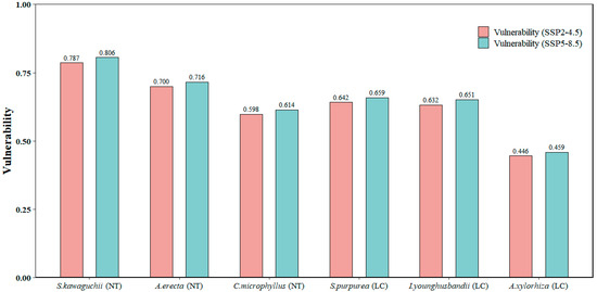 Similar to the sensitivity indicators, all six plant species showed significant vulnerability to the PWQ across their ranges. Four of these species—A. erecta, S. purpurea, I. younghusbandii and A. xylorhiza—additionally showed significant vulnerability to the MTWQ. On the other hand, S. kawaguchii and C. microphyllus showed significant vulnerability to the MDR and PS. Notably, all six plant species exhibited low vulnerability to the PCQ. Furthermore, in the projected future climate change scenarios up to 2050, the vulnerability factors of each bioclimatic variable were generally higher under the high carbon emission scenario than the corresponding values under the moderate carbon emission scenario (Table 1). For the total vulnerability of each species, we found, after normalization, that S. kawaguchii had the greatest overall vulnerability and A. xylorhiza had the least. In addition, the total vulnerability of all species was higher in the high carbon emission scenario than in the moderate carbon emission scenario. Among them, the total vulnerability of C. microphyllus was lower than that of S. purpurea and I. younghusbandii, but the endangerment rating of C. microphyllus was near threatened (NT), while the endangerment rating of S. purpurea and I. younghusbandii was least concern (LC). This suggests that conservation assessments of C. microphyllus in the context of future climate change need to pay particular attention to the potential threats posed by climate change, and that it is necessary to incorporate the impacts of future climate change on the species into the assessment metrics of the red list (Table 1 and Table 2; Figure 1) [30,40,42].