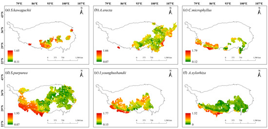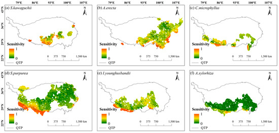Overall, the spatial sensitivity distribution maps showed that the spatial sensitivities of these six species showed a gradient trend of being high in the south and low in the north, and the sensitivities were generally low in most areas of their habitats (dominated by green in Figure 2). Specifically, S. kawaguchii and A. erecta showed high sensitivity in most areas of their habitats compared with the other four species, especially around the Himalayas and in the central Tibetan-Himalayan region. In addition, A. erecta also showed high sensitivity in the vicinity of the HDMs. C. microphyllus, S. purpurea, I. younghusbandii, and A. xylorhiza showed high sensitivity in the southern Himalayas. Meanwhile, C. microphyllus and I. younghusbandii also showed high sensitivity in the central Tibetan-Himalayan region, while S. purpurea showed high sensitivity near the HDMs. Compared with the spatial sensitivity of S. kawaguchii and A. erecta, C. microphyllus, S. purpurea, I. younghusbandii, and A. xylorhiza showed lower sensitivity in most areas of their habitats (Figure 2).
