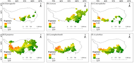 Under future climate changes, the spatial exposure of these six species tended to be high in the north and low in the south within their habitats, with low spatial exposure, especially near the Himalayas and the east-central Tibetan-Himalayan region. C. microphyllus, S. purpurea, I. younghusbandii, and A. xylorhiza showed higher spatial exposure in most parts of their habitats compared with S. kawaguchii and A. erecta (Figure 3). In addition, the spatial exposure of these six species in the same areas was higher in the SSP5-8.5 scenario compared with the SSP2-4.5 scenario (Figure S2).