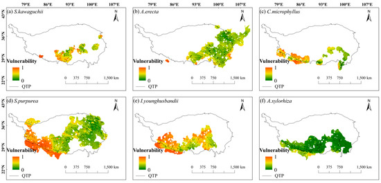 From the spatial vulnerability distribution map, it can be seen that the spatial vulnerability of these six species showed a distribution pattern of being high in the west and low in the east. In addition, in the central Tibetan-Himalayan region and the HDMs, all six species showed low vulnerability to climate change. Specifically, S. kawaguchii and A. erecta showed significant vulnerability in most areas of their habitats (red and light green colors dominated their habitats in Figure 4). In contrast, the vulnerability of C. microphyllus, S. purpurea, I. younghusbandii, and A. xylorhiza was higher in the western part of the Tibetan-Himalayan region and gradually decreased in the eastern direction. C. microphyllus, S. purpurea, and I. younghusbandii showed extremely low vulnerability to climate change in the eastern part of their habitats, while A. xylorhiza showed extremely low vulnerability to climate change throughout its habitat. Overall, S. kawaguchii had the highest spatial vulnerability, while A. xylorhiza had the lowest spatial vulnerability (Figure 4). For the different SSPs, the areas of high vulnerability in the SSP2-4.5 scenario also showed higher vulnerability in the SSP5-8.5 scenario (Figure S3).