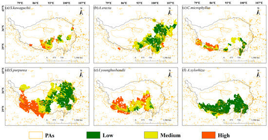 The vulnerability of these six species within their habitat ranges showed a distribution pattern of being high in the west and low in the east. In addition, the climate change vulnerability of these six species was generally low in the central Tibetan-Himalayan region and the HDMs. Based on data on the percentage of area covered by protected areas in relation to species habitat, the protected area coverage for these six species in the Tibetan-Himalayan region was generally low, with none exceeding 25%. Among them, S. kawaguchii and A. erecta, which are assessed as NT species by the Red List of Chinese Plants database, had extremely low habitat coverage in nature reserves, being 8.55% and 12.48%, respectively, and in the areas with the highest vulnerability level, the coverage of their protected areas was only 3.25% and 0.67%, respectively. However, C. microphyllus, which was assessed as NT and had the smallest habitat area, had the highest habitat coverage of the six species in nature reserves at 25.02%; however, in the area with the highest vulnerability rating, it had only 5.72% protected area coverage. Overall, the habitats of the three species assessed as NT generally had low coverage in nature reserves, and none of the areas with the highest vulnerability ratings had more than 6% protected area coverage (Table 3; Figure 5; Figure S4).