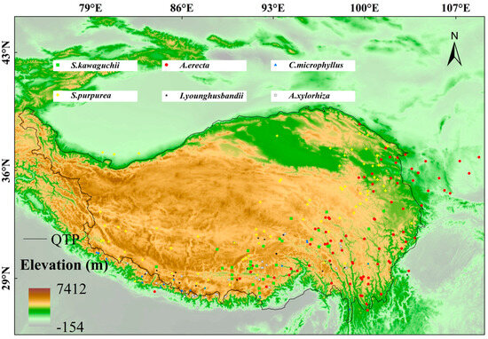 In this study, we focused on six plants endemic to the Tibetan-Himalayan region (73–110° E, 25–45° N): S. kawaguchii, A. erecta, C. microphyllus, S. purpurea, I. younghusbandii, and A. xylorhiza. These species are highly specialized, growing only in alpine soils above 3000 m in elevation and having an extremely narrow geographic distribution. Among them, S. kawaguchii belongs to the genus Syncalathium in the family Asteraceae, A. erecta belongs to the genus Androsace in the family Primulaceae, C. microphyllus belongs to the genus Cyananthus in the family Campanulaceae, S. purpurea belongs to the genus Stipa in the family Poaceae, I. younghusbandii belongs to the genus Incarvillea in the family Bignoniaceae, and A. xylorhiza belongs to the genus Anaphalis in the family Asteraceae. As endemic species with a restricted distribution in this region, these species belong to different families and cover different functional groups, exhibiting extreme sensitivity to climate change. Their habitat specificity makes them ideal model organisms for assessing the impact of climate change on alpine endemic species. Among these, S. kawaguchii, A. erecta, and C. microphyllus have been evaluated as near threatened (NT) by the Red List of Chinese Plants database (https://www.iplant.cn/rep/protlist, accessed on 2 August 2025), while S. purpurea, I. younghusbandii, and A. xylorhiza have been evaluated as least concern (LC). We collected occurrence records from multiple sources, including the Chinese Virtual Herbarium (CVH: https://www.cvh.ac.cn/), the Global Biodiversity Information Facility (GBIF: http://www.gbif.org/) (GBIF.org, GBIF Occurrence Download. Available online: https://doi.org/10.15468/dl.wq8pkm (accessed on 2 August 2025)), and previously published studies [68,69,70]. We then filtered the data to exclude records with incomplete information, duplicates, and those located in urban centers, retaining only records dated after 1950. To mitigate overfitting caused by spatial autocorrelation, we employed the k-nearest neighbors technique [71], ensuring that only one sample point was retained within a 5 km radius. The final samples size for modeling ranged from 21 to 102 occurrences per species (Table S1), with their spatial distribution shown in Figure 7.