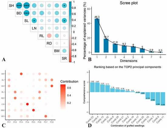 Principal component analysis of growth-related traits in different grafting combinations. (A) The correlation analysis of growth-related indicators used for the comprehensive evaluation of graft compatibility among different combinations; (B) variance contribution rate of each principal component; (C) correlation between seedling growth-related indicators and principal components; and (D) comprehensive evaluation score of each combination. The size of circle in (A) represented correlation coefficient, while * represented p < 0.05, *** represented p < 0.001.