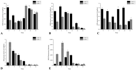 Ascorbate peroxidase (APX) enzyme activity also showed an initial decrease followed by an increase. Comb. 4 showed higher ascorbate peroxidase (APX) enzyme activity than Comb. 7 during 0–22 DPG, with a peak at 22 DPG, whereas Comb. 7’s APX activity remained low until 32 DPG (Figure 2C).