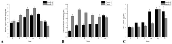 Comb. 7 maintained higher soluble sugar (SS) levels than Comb. 4 from 0 to 12 DPG, peaking at 12 DPG, while Comb. 4 showed delayed accumulation with a peak at 22 DPG. By 22–32 DPG, Comb. 4 retained significantly higher SS, which may support late-stage vascular reconnection and biomass accumulation (Figure 3A). This pattern suggests that Comb. 4 efficiently allocates sugars from storage to active growth, whereas Comb. 7 may suffer from impaired sugar transport, leading to early accumulation but late-stage depletion.