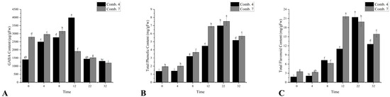 The gamma-aminobutyric acid (GABA) content initially increased and then decreased. Comb. 7 had higher GABA levels from 0 to 8 DPG, peaking at 8 DPG, while Comb. 4 peaked later at 12 DPG. GABA is involved in stress signaling, and the delayed peak in Comb. 4 may reflect a more controlled stress response, rather than the acute stress seen in Comb. 7 (Figure 4A).