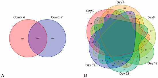 Venn diagram of DEGs identified during the healing process of different grafting combinations (A) and DEGs identified in the comparison of different grafting combinations at different stages during the healing process (B).