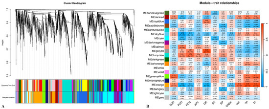 WGCNA of DEGs between different combinations during its healing process. (A) Hierarchical cluster tree showing co-expression modules identified by WGCNAs; each branch in the tree represents an individual gene. (B) Correlation between module eigengenes and physiological/biochemical indicators during the healing process post-grafting.