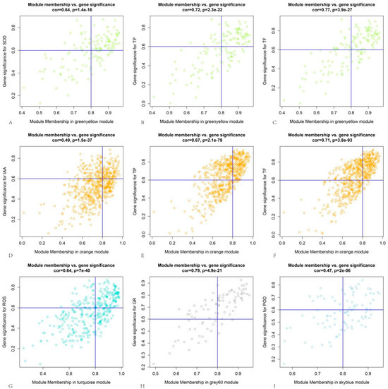 Correlation analysis between coexpression gene modules and traits: (A) correlation analysis between green-yellow module and SOD activity; (B) correlation analysis between green-yellow module and TP content; (C) correlation analysis between green-yellow module and TF content; (D) correlation analysis between orange module and IAA content; (E) correlation analysis between orange module and TP content; (F) correlation analysis between orange module and TF content; (G) correlation analysis between turquoise module and ROS fluorescence intensity; (H) correlation analysis between grey60 module and GR activity; and (I) correlation analysis between sky-blue module and POD acitivity. The blue line in the each figure represents the threshold of the corresponding coordinate axis.