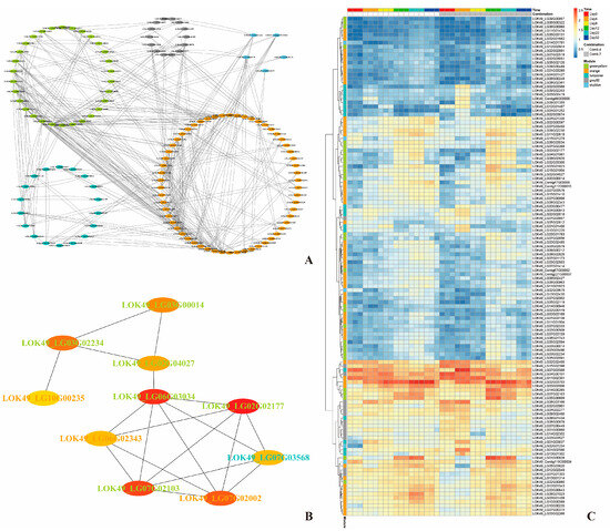 The PPI network and heatmap analysis of DEGs associated with physiological indicators: (A) gene co-expression networks of DEGs associated with physiological/biochemical indicators during the healing process post-grafting; (B) correlation network of top 10 nodes associated with physiological/biochemical indicators during the healing process post-grafting; and (C) heatmap showing the expression profiles of DEGs in modules significantly correlated to physiological/biochemical indicators during the healing process post-grafting. The color depth of each cell represents the gene expression level by log2(fpkm + 1).