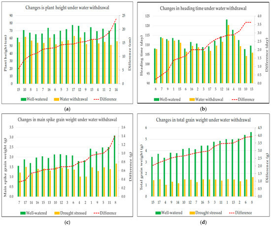 Changes in agronomic traits in response to drought stress: (a) plant height, (b) heading time, (c) grain weight of main spike, and (d) total grain weight. In each graph, the X-axis represents the code numbers of the evaluated genotypes. The left Y-axis displays the values of the measured trait illustrated by bar plots, while the right Y-axis shows the differences between the treatment means, represented by the red line.