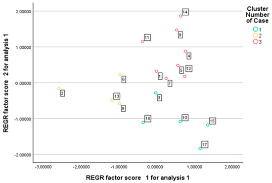 Although five principal components were initially extracted, only the first three were used for k-means clustering, as they accounted for 70.7% of the total variance and captured the major patterns of trait variation. Including only the leading components allowed for a clearer cluster structure while avoiding the introduction of noise associated with lower-variance dimensions. The algorithm converged after three iterations, with minimal changes in cluster centers, indicating the stability of the solution (maximum center change < 0.000). The final cluster centers indicated clear separation along all three principal components. Cluster 1 was characterized by positive PC1 values and negative PC2 scores; Cluster 2 showed strongly negative PC1 and slightly negative PC2 values; while Cluster 3 exhibited positive scores along the PC2 and PC3. A total of 17 genotypes were assigned to three distinct clusters, with 5 genotypes in Cluster 1, 4 in Cluster 2, and 8 in Cluster 3 (Figure 3). This classification provided a structured framework for the comparative evaluation of genotypic trait patterns across the identified groups. Cluster characterization was based on the mean values of relative percentage reductions caused by drought stress, calculated for each cluster.