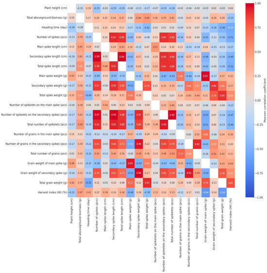 Pearson’s correlation coefficients were calculated for all measured traits under both well-watered and drought-stressed conditions. The resulting correlation matrices were visualized as heatmaps (Figure 4) to examine how drought stress influenced the interrelationships among key morphological parameters. The bivariate correlation structure is split across the heatmap: drought-related values are located in the lower triangle, and control treatment correlations are positioned in the upper triangle. Due to the large number of correlation coefficients, not all changes in the relationships were described within the scope of this article; however, these alterations can also be interpreted from the heatmap. We focused our detailed analysis exclusively on changes affecting the four key traits previously identified—plant height, heading time, grain weight of the main spike, and total grain weight—where the absolute change in the Pearson’s correlation coefficient between the irrigated and drought-stressed treatments was equal to or greater than 0.4.