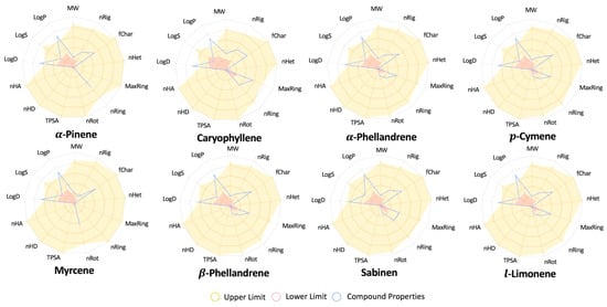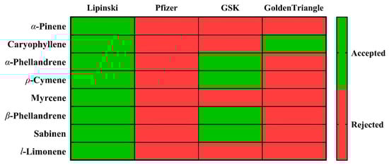 As can be seen in the figure, all the analyzed compounds meet the Lipinski criterion. However, only α-phellandrene, ρ-cymene, β-phellandrene, and sabinene meet the GSK criterion. In contrast, only caryophyllene meets the Golden Triangle criterion.
