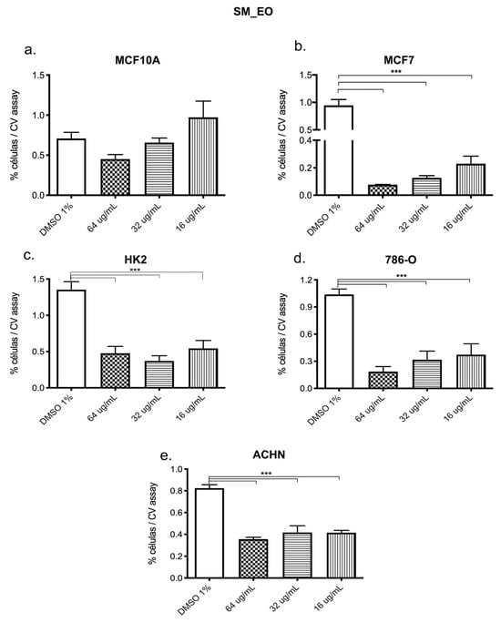 To evaluate the selective cytotoxicity of the SM_EO on human epithelial non-tumor and tumor cells lines, epithelial mammary cells MCF10A (non-tumoral) and MCF7 (tumoral) and epithelial renal cell lines HK-2 (non-tumoral), 786-O, and ACHN (tumoral) were obtained from the American Type Culture Collection (ATCC, Rockville, MD, USA). The cells were cultured in Dulbecco’s modified Eagle’s F-12 medium (DMEM-F12; Gibco, Waltham, MA, USA) supplemented with 10% fetal bovine serum (FBS; Gibco, Waltham, MA, USA) and maintained at 37 °C under 5% CO2. When the cells reached 80% confluence, the cultures were replicated. The numbers of cell passages were approximately 5–10. In vitro assays were performed with triplicates of three independent experiments for each cell line [21].