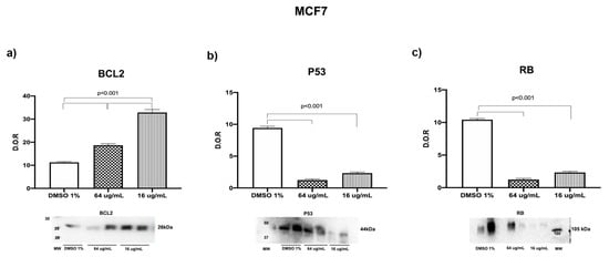 The RIPA buffer was used to lyse MCF7 cells and Micro BCA (Protein Assay Kit, Thermo Scientific Inc., Waltham, MA, USA) to quantify the total proteins in samples. Proteins were separated in an SDS-PAGE 13% gel and electro-transferred to a PVDF membrane. Afterward, the membranes were washed with TBS-T 0.1% buffer 1X (Tris-base 20 mM, NaCl 137 mM, 0.1% Tween-20) and blocked with 5% (w/v) human serum albumin (Sigma-Aldrich, 0055 K, St. Louis, MO, USA). The membranes were washed with TBS-T 0.1% and incubated overnight at 4 °C with the following primary antibodies: BCL-2 (ab4051, 1:300 dilution, Abcam plc), P53 (ab32138, 1:500 dilution, Abcam plc), RB and β-actin (sc-47778, 1:1000 dilution, Santa Cruz Biotechnology Inc., Dallas, TX, USA). Afterward, membranes were incubated for 90 min at room temperature in the presence of the horseradish peroxidase-conjugated secondary antibody (1:3000 polyclonal goat anti-rabbit biotinylated, Dako Cytomation, Glostrup, Denmark). After five washes in TBS-T, specific bands were detected via chemiluminescence (ECLTM, Amersham, Sigma Aldrich, Dorset, UK) using a ChemiDoc XRS+ System with Image Lab Software (Version 6.1) from Bio-Rad (Hercules, CA, USA). To achieve consistent quantification across Western blot bands, the narrowest band was selected as a reference to standardize an area, which was then systematically applied to all bands. Only the pixel intensity in this standardized area was quantified, ensuring a uniform area size throughout the analysis following the guidelines outlined in the FIJI Image Processing package guide (x86-64). In cell extracts, β-actin levels were utilized as a loading control to verify equal protein loading in the gel.