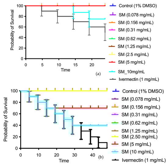 To assess the survival rate, all nematodes were examined after 24 and 48 h. Nematodes were classified as alive if they exhibited any movement of the tail, head, or pharynx during a 5 s observation period; otherwise, they were considered dead. The mortality rates were calculated based on the observed counts. [21,48].