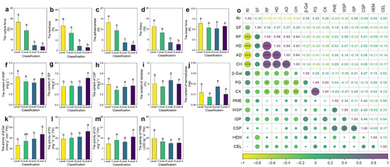 Differences in pepper fruit texture (a–e), cell wall components (f–j), and pectinase activity (k–n) across different levels of rugose surface classification, along with correlations among the indicators. (a) Rupture force (RF). (b) Hardness (HD). (c) Adhesiveness (AD). (d) Chewiness (CH). (e) Shear force (SF). (f) Water-soluble pectin (WSP) content. (g) Ionically soluble pectin (ISP) content. (h) Covalently soluble pectin (CSP) content. (i) Cellulose (CEL) content. (j) Hemicellulose (HEM) content. (k) β-Galactosidase (β-Gal) activity. (l) Polygalacturonase (PG) activity. (m) Cellulase (CX) activity. (n) Pectin methylesterase (PME) activity. (o) Correlation analysis among all indicators. Data are presented as the mean ± SE (n = 3). The size of the points indicates the strength of the correlation (absolute Pearson’s r), with larger points representing stronger correlations. For (a–n), different letters indicate statistically significant differences (p < 0.05). For (o), * denotes significance at p < 0.05, ** at p < 0.01, and *** at p < 0.001.