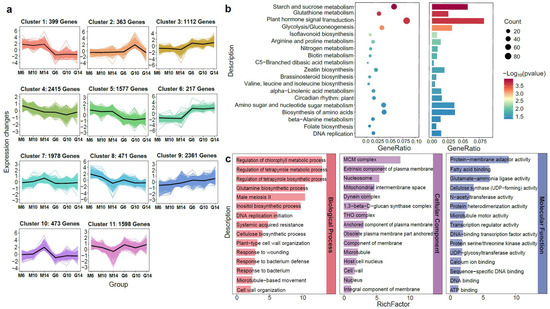 To explore stage-specific transcriptional dynamics, K-means clustering was performed on DEGs from six developmental comparisons (G6 vs. M6, G10 vs. M10, G14 vs. M14, M6 vs. M10, M10 vs. M14, and M6 vs. M14), resulting in 11 co-expression modules (Figure 3a). Clusters 1, 5, and 10 showed predominant expression in rugose fruits, while Clusters 3 and 6 were mainly expressed in smooth fruits. KEGG enrichment analysis revealed these modules were linked to pathways involved in cell wall biosynthesis, cell expansion, hormone signaling, and stress response, including starch and sucrose metabolism and alpha-linolenic acid metabolism (Figure 3b). These findings suggest that rugosity formation is regulated by coordinated modulation of cell wall remodeling and phytohormone signaling. GO enrichment analysis further confirmed the significance of microtubule-related functions (microtubule-based movement, microtubule structure, and motor activity) in the BP, CC, and MF categories (Figure 3c), underscoring their potential roles in surface morphology differences between rugose and smooth fruits.