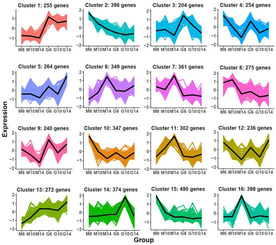 K-means clustering of differentially expressed genes (DEGs) identified as specific to the developmental process of rugose fruit. The x-axis represents different samples collected from two parental lines (M: rugose; G: smooth) at three developmental stages (6, 10, and 14 days post-anthesis). The y-axis denotes the standardized gene expression levels. The colored areas in the background represent the expression trajectories of individual genes with-in each cluster, while the bold black line denotes the average expression profile of all genes in the cluster.