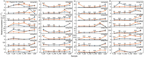Expression profiles of 32 candidate genes across different tissues and developmental stages. The pepper UBIQUITIN (UBI) gene was used as a constitutive control. The relative expression was calculated using the 2−ΔΔCt method. Orange lines represent the rugose surface variety, and blue lines represent the smooth surface variety. Data are shown as the mean ± SE from three technical replicates and three biological replicates. Statistical significance was determined by Student’s t-test: * p < 0.05; ** p < 0.01; and *** p < 0.001. F_0d, ovary; F_6d, fruit at 6 days post-anthesis; F_10d, fruit at 10 days post-anthesis; F_14d, fruit at 14 days post-anthesis.