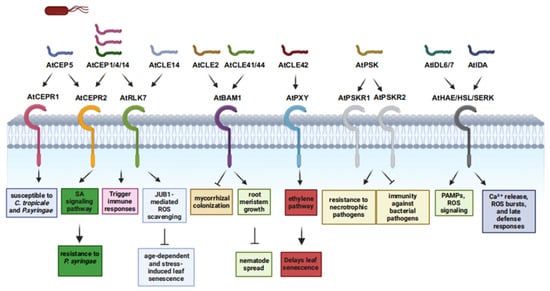 | PSK | A. thaliana, tomato, rice, cotton | Suppresses bacterial immunity; enhances necrotroph resistance; interacts with phytohormones | [,,,] | |